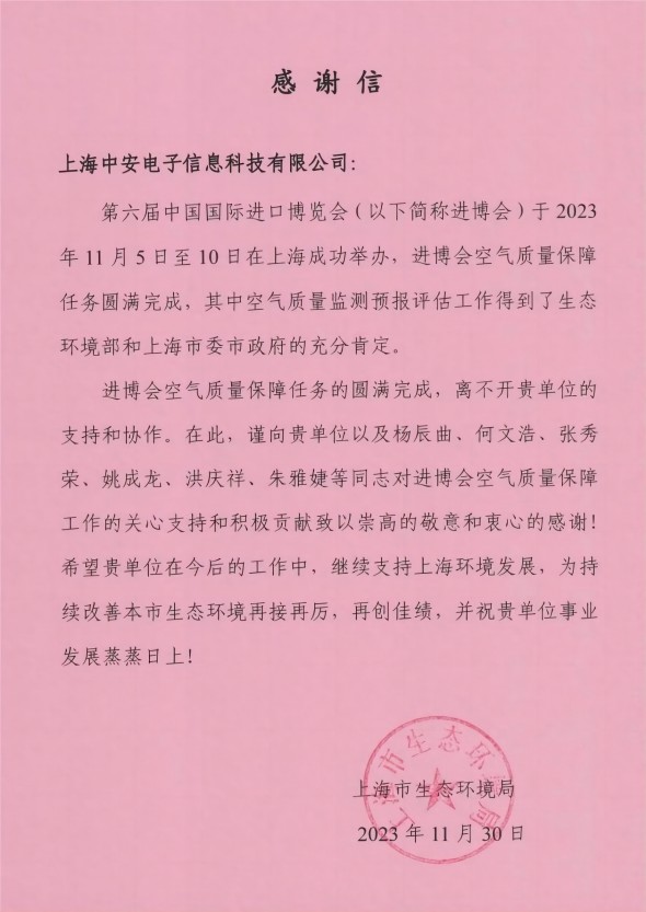 上海環(huán)監(jiān)中心就中安科技在21年國際進博會空氣質(zhì)量監(jiān)測預(yù)報工作中杰出貢獻送來感謝信!(2021/12/31)